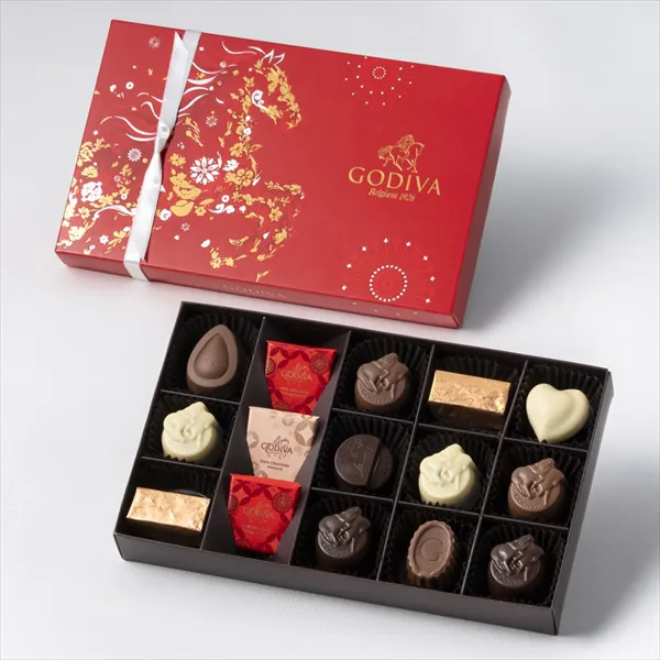 年の始めに白馬を見ると一年の邪気が払われるとされた故事にちなみ、白馬をデザインした華やかなパッケージに、馬に乗ったレディゴディバをデザインしたチョコレートなどを詰め合わせました。