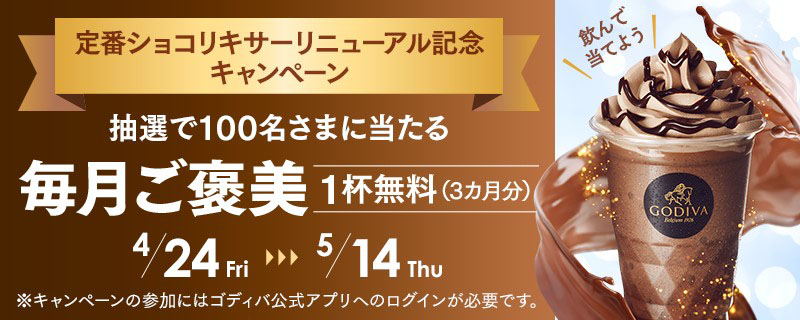 キャンペーン対象期間中に、ショコリキサーを1杯以上ご購入の方 かつ ゴディバ公式アプリでログインを完了された方