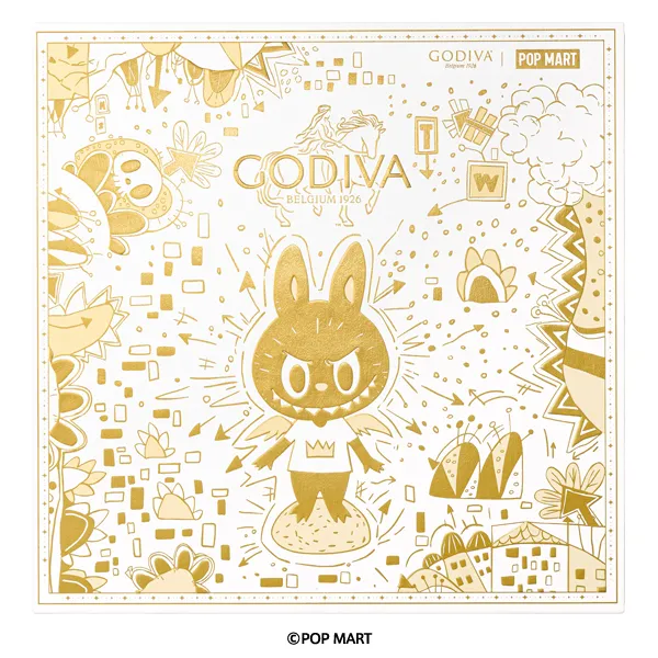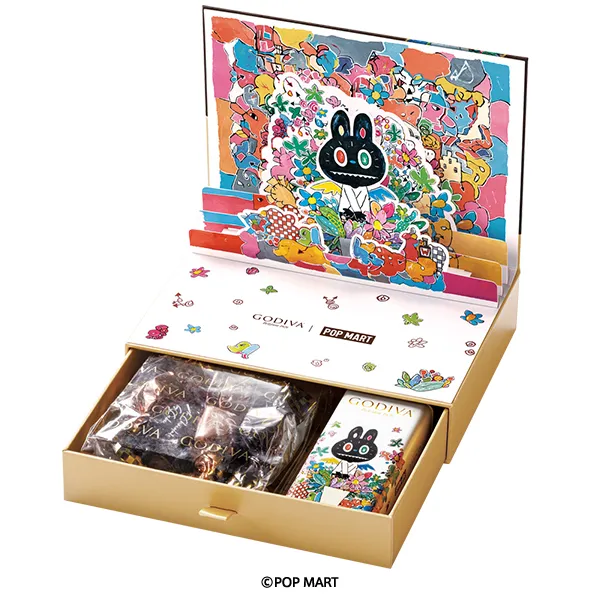 ポップアップ・ボックスの引き出しに、ダークとミルクのG キューブ計5粒と、LABUBUのイラストが描かれたパール缶を詰め合わせました。