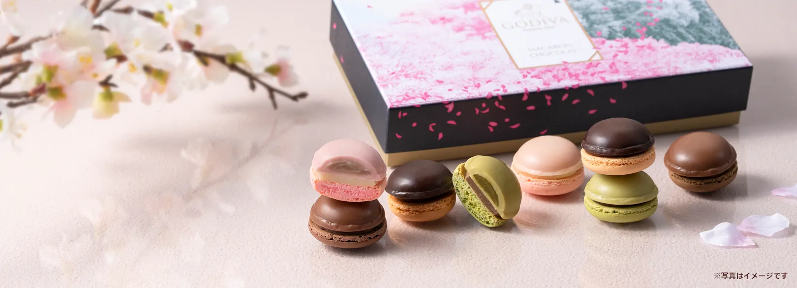 桜のイラストを用いたパッケージは、春のギフトにもふさわしいデザイン。大切な人への気持ちをマカロンにのせて伝えてみませんか?