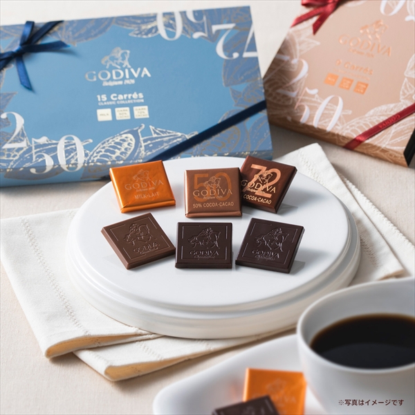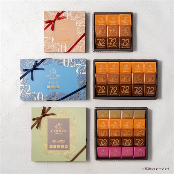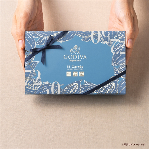 ゴディバのチョコレートへのこだわりが際立つ、薄いスクエアタイプのチョコレート、カレのアソートメントが15枚入りで登場。美しいカカオを描いたパッケージに、カカオを存分に堪能できるミルク、カカオ50%ダーク、カカオ72%ダークの3種類のカレを詰め合わせました。上品な味わいを手土産や、大切なシーンでの贈り物にぜひどうぞ。