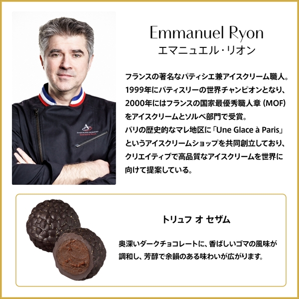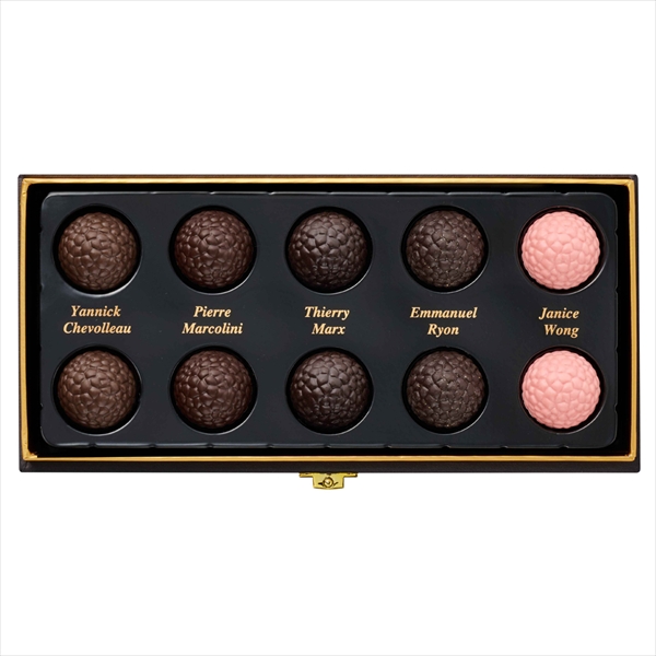 ゴディバの創立100周年を祝して、世界の舞台で活躍するスターシェフ5人がカカオへの深い敬愛を込め、それぞれの感性で創り上げた限定トリュフが誕生しました。ひと粒ごとにそれぞれのスターシェフの感性輝く、カカオの深い味わい。それらを、真っ黒な黒トリュフのようになシックな箱に詰め、特別な10粒のアソートとしてお届けします。