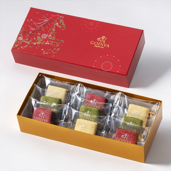 サクっと焼き上げたサブレでなめらかなチョコレートガナッシュをサンドしました。新年らしい色合いの定番サブレショコラ3種を2026年の干支のシンボルである馬を上品にあしらった限定のデザインボックスに詰め合わせました。
