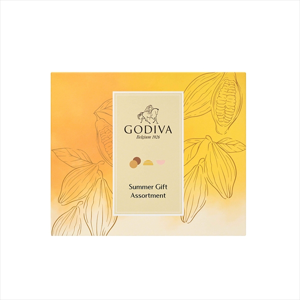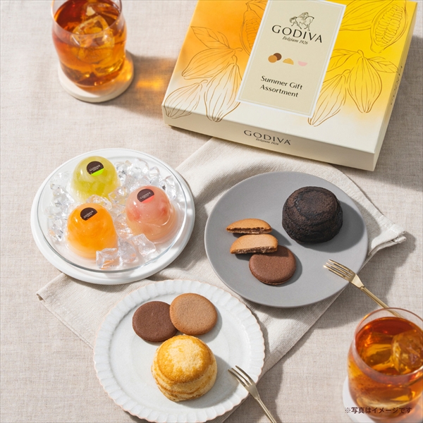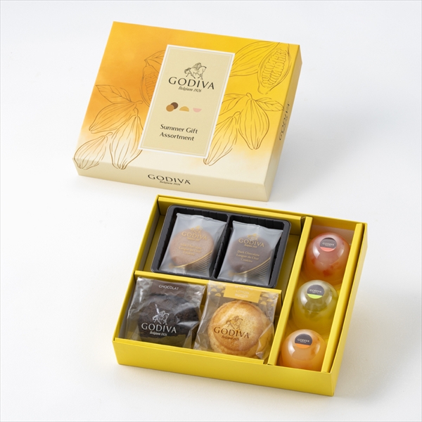 ゴディバで人気の「カカオフルーツ ジュレ」「ラングドシャクッキー」「ドームバームクーヘン」の3種を色とりどりにアソートしました。夏の爽やかさをグラデーションで表現した限定パッケージに詰め合わせました。