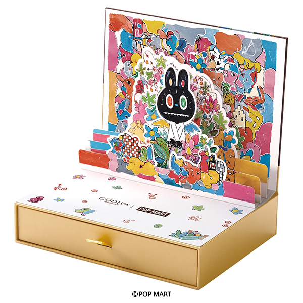 ポップアップ・ボックスの引き出しに、ダークとミルクのG キューブ計5粒と、LABUBUのイラストが描かれたパール缶を詰め合わせました。