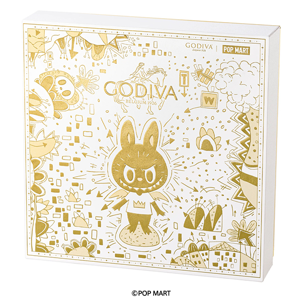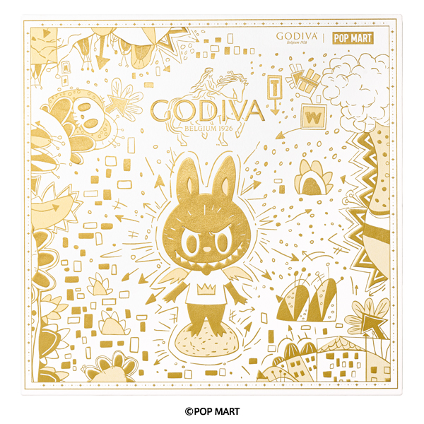 ゴールドカラーのLABUBUのイラストが描かれたボックスに、LABUBU型のタブレットチョコレートと、ティーカップ&スプーンをセットしました。