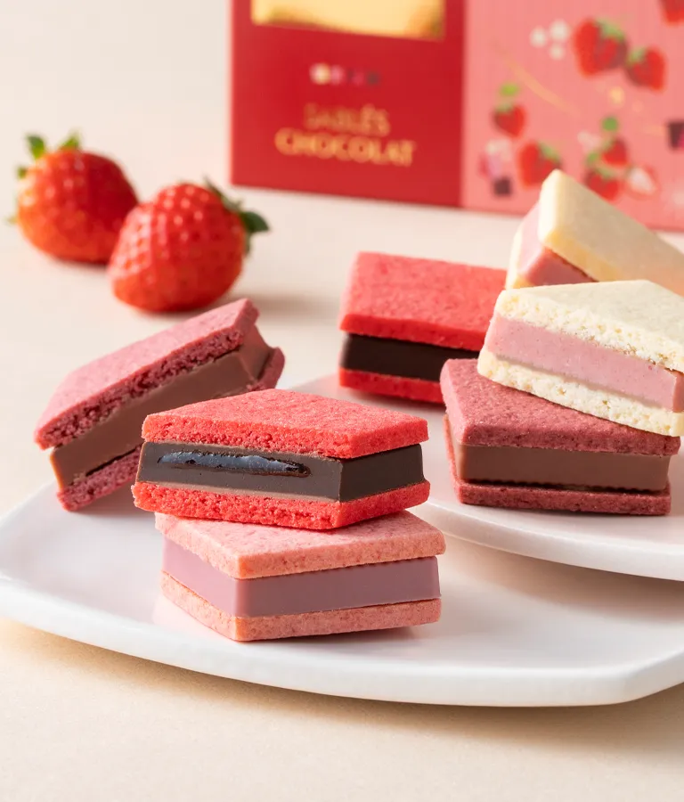甘酸っぱい苺の風味が溶け込んだミルクチョコレートガナッシュを苺パウダー入りのサクっとしたサブレでサンドしました。苺の酸味がミルクチョコレートの味わいを引き立てます。