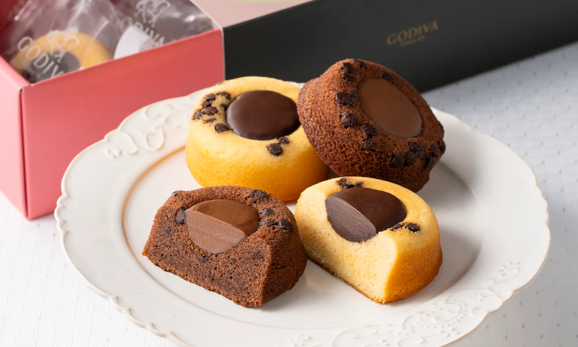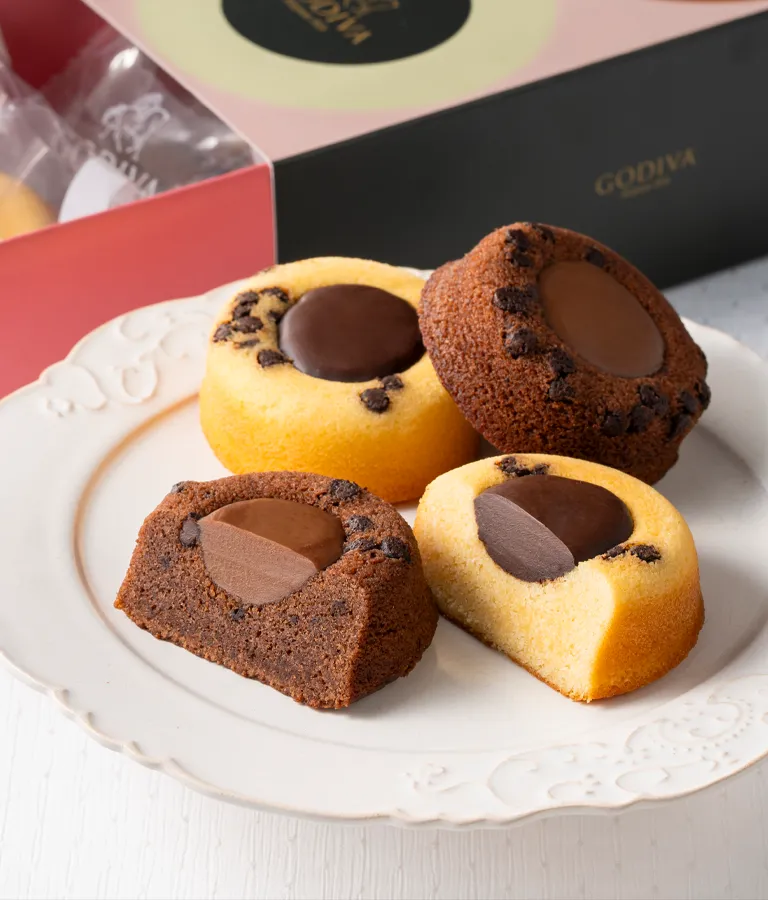 アーモンドパウダーを混ぜた生地をしっとりと焼き上げ、真ん中になめらかなチョコレートガナッシュを流し込みました。優しい甘さのふんわりとした生地に浮かぶほろ苦いチョコチップがアクセントになっています。