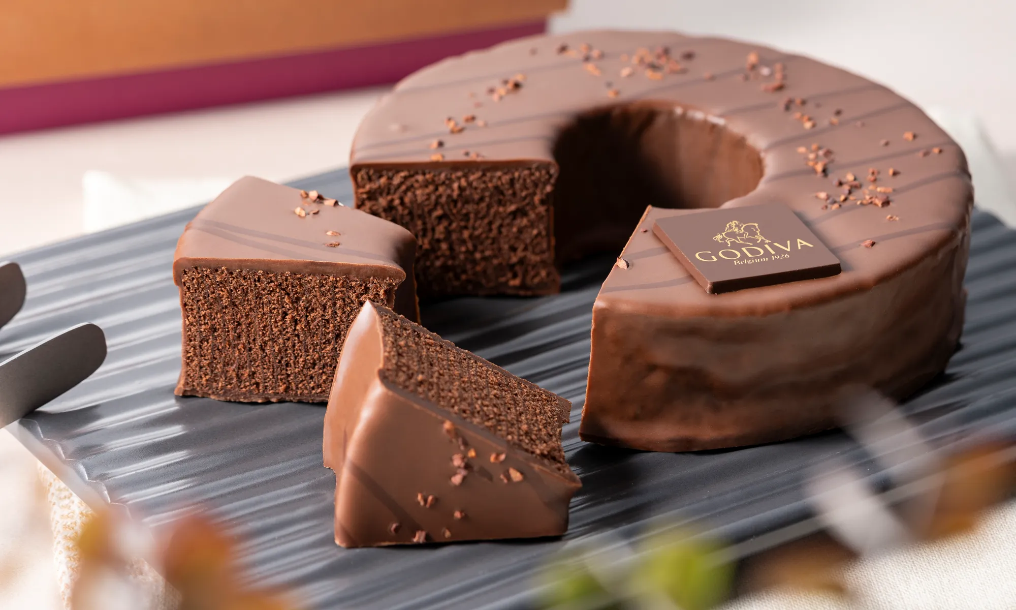 アーモンドパウダーを混ぜた生地をしっとりと焼き上げ、コクのあるヘーゼルナッツガナッシュを流し込みました。カカオ生地に浮かぶほろ苦いチョコチップが、楽しいアクセントになっています。