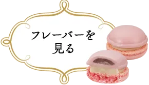 桜の葉のパウダー入りチョコレートソースを閉じ込めたホワイトチョコレートと桜色のマカロンで、ホワイトチョコレートガナッシュをサンド。